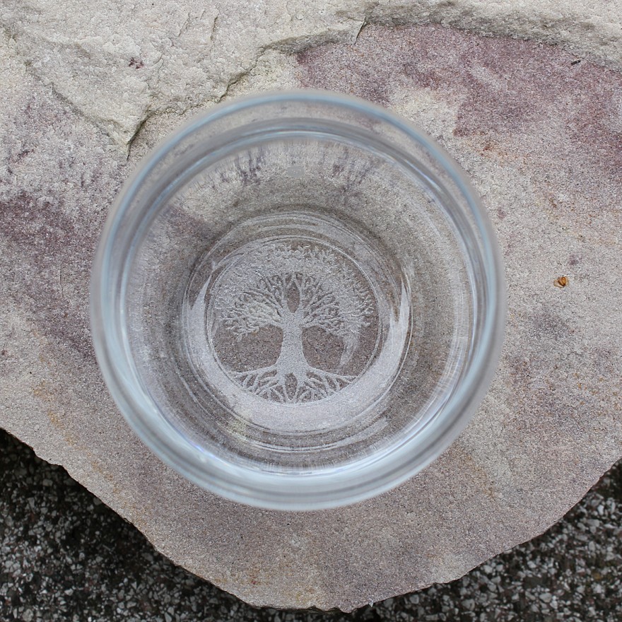 Glas-Trinkbecher mit Lebensbaum eingelasert in weiss im Glasboden Grundmaterial frei von Blei