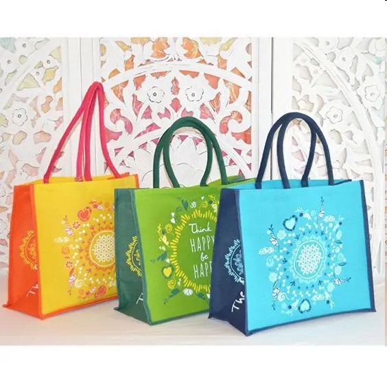 Rückseite mit Text: Think Happy Be Happy mit abwischbarer Innenbeschichtung, Material: 67% Jute, 26% Baumwolle, 7% LDPE -Beschichtung lebensmittelgerecht; Runde Baumwollgriffe, auswischbar und unauffällig gegen Verschmutzung, Herstellung erfolgt unter den fairen und strengen Vorgaben des ETI-Basecodes (Ethical Trading Initiative); produziert in Indien