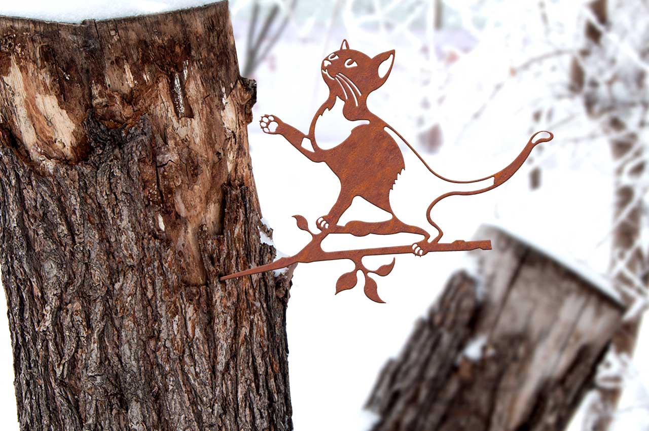 | Nach einer Weile bekommt der Stecker eine Rostschicht. Durch diese Farbe bekommt der Vogel einen noch natürlicheren Touch. Das sorgt für eine noch schönere Optik und wunderschöne Farbverläufe. Genau wie unsere Natur. Bitte beachten Sie daher, dass es Farbabweichungen geben kann! Die Fotos können nur das allgemeine Aussehen des Steckers wiedergeben. Übrigens haben wir unsere Baumstecker so gestaltet, dass sie ohne Bedenken in die Baumrinde geschlagen werden können. Ihr Baum verschließt die Einschlagstelle einfach und ist so weiterhin vor Wind und Wetter geschützt. Die Katze ist ein freihteitsliebendes Tier. Es braucht seinen gewohnten Gang nach draußen, um seinem Jagdtrieb nachzukommen. Die Katze ist aus Stahl und kann auch in Ihrem Garten ein neues zu Hause finden. Suchen Sie sich für den Baumstecker einen robusten Baum aus in Ihrem Garten. Sie benötigen noch einen Hammer und eine Leiter und können so der Katze ein neues zu Hause geben. |