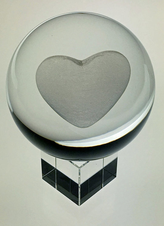 Kristallglas Kugel 70mm mit 3 D Laser-Innengravur Herz auf Sockel