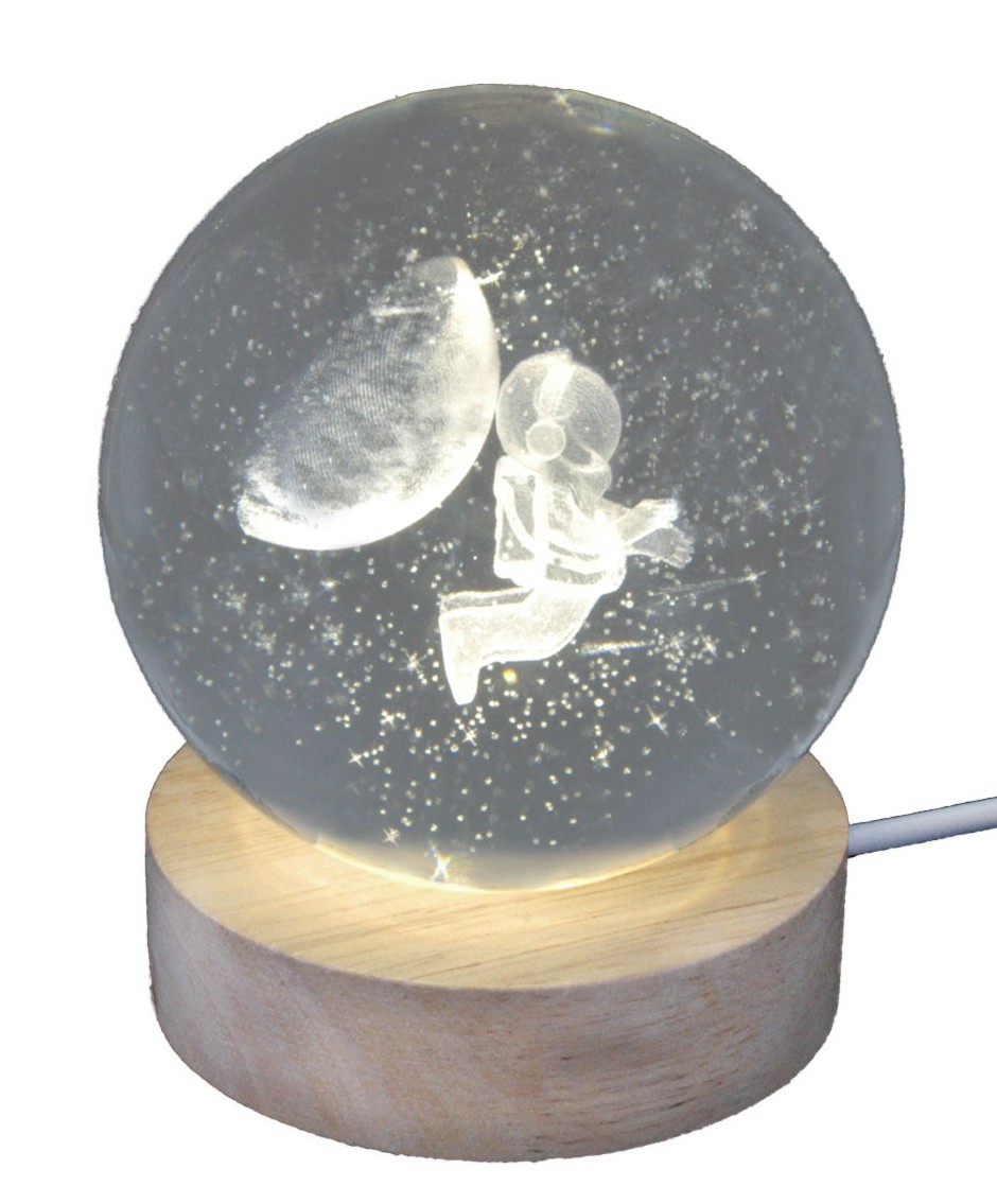 Hologramm Glaskugel Astronaut 8 cm mit Holz LED-Untersetzer
