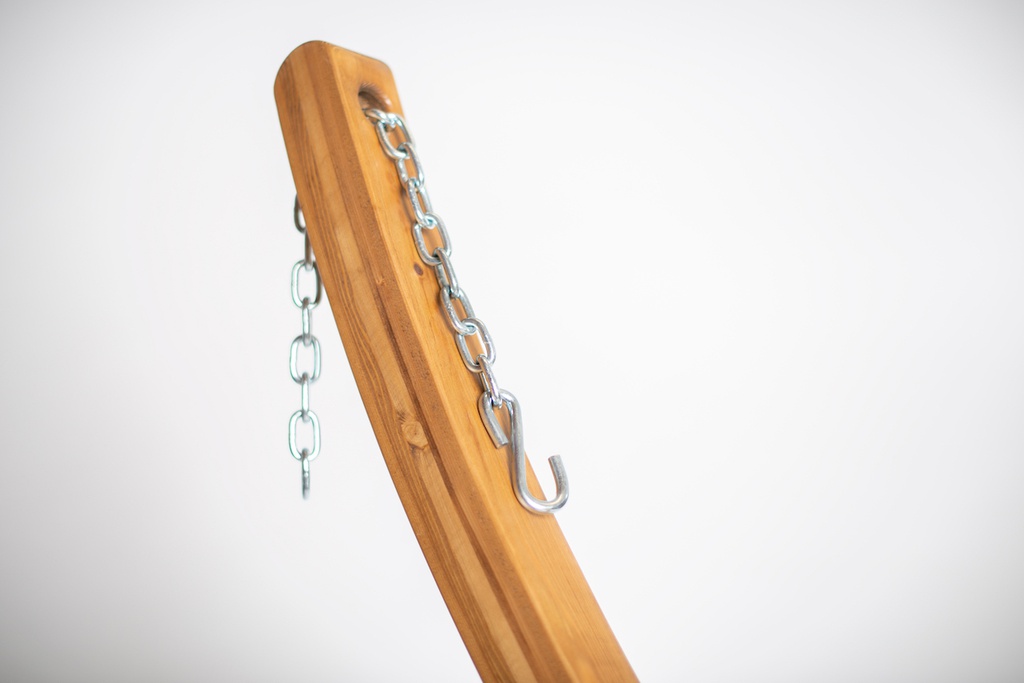Gestell aus FSC™-zertifizierter Lärche für Einzel-Hängematten, Materialbeschreibung: Holz: sibirische Lärche (FSC®-zertifiziert), Schrauben: Galvanisiertes Eisen, Metall-Haken: SAE 304 rostfreier Stahl, Holz in Hochdruck-Schichtverleimung, patentiertes QuickExtend-System, Herstellungsland: China