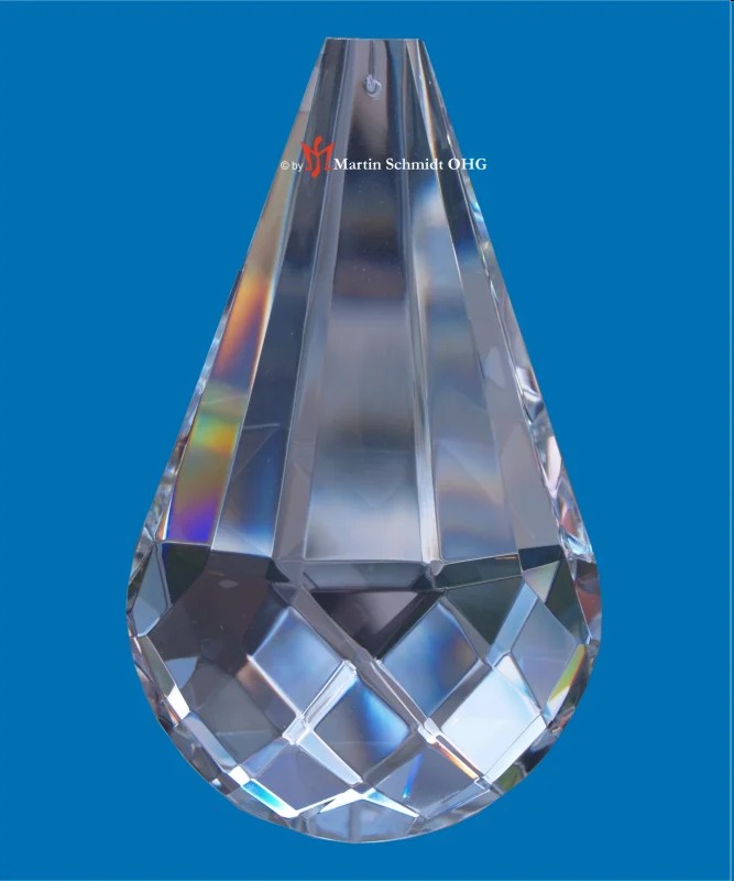Material: Kristallglas klar mit 30% Bleigehalt, Großer Tropfen mit Facettenschliff, gelocht mit Aufhängefaden