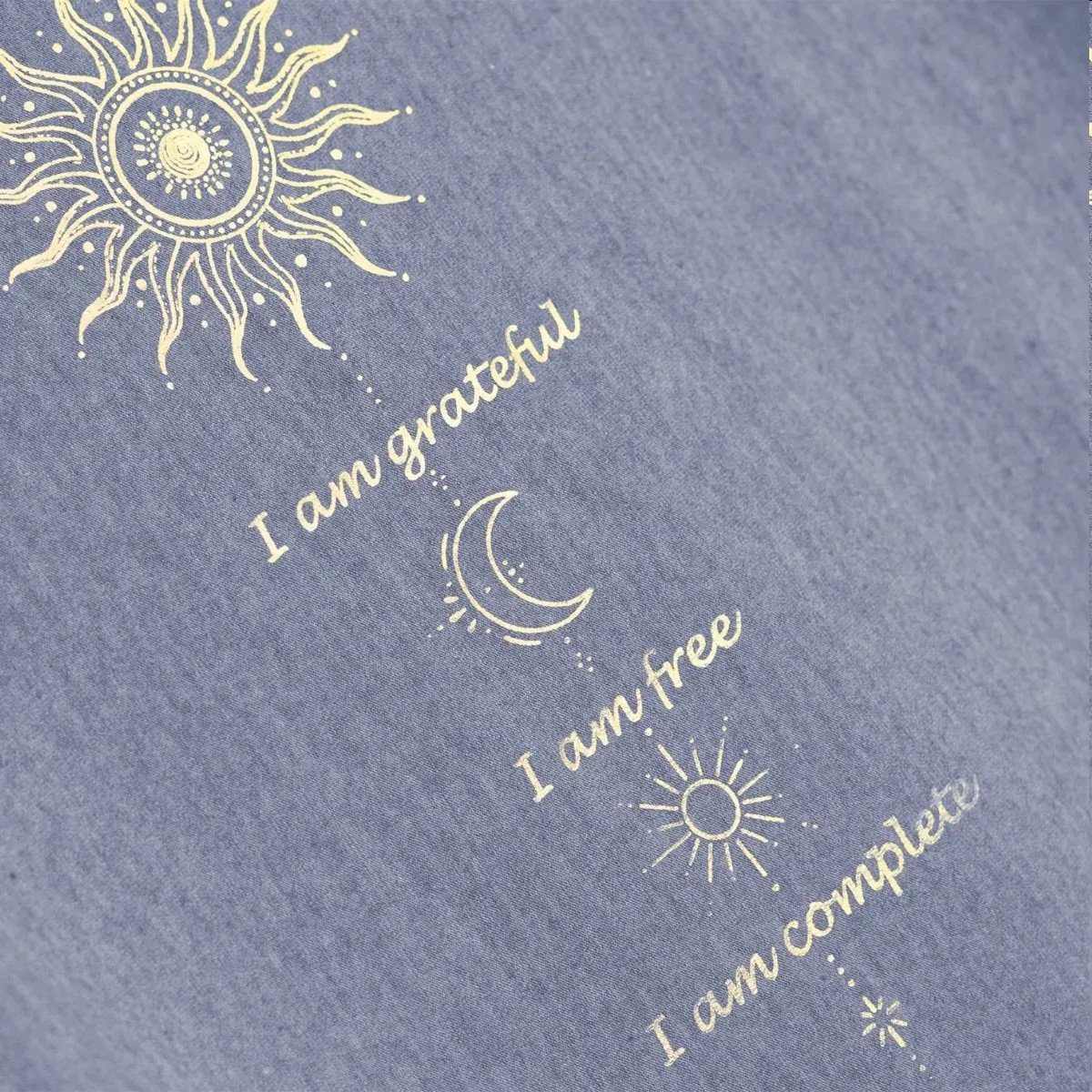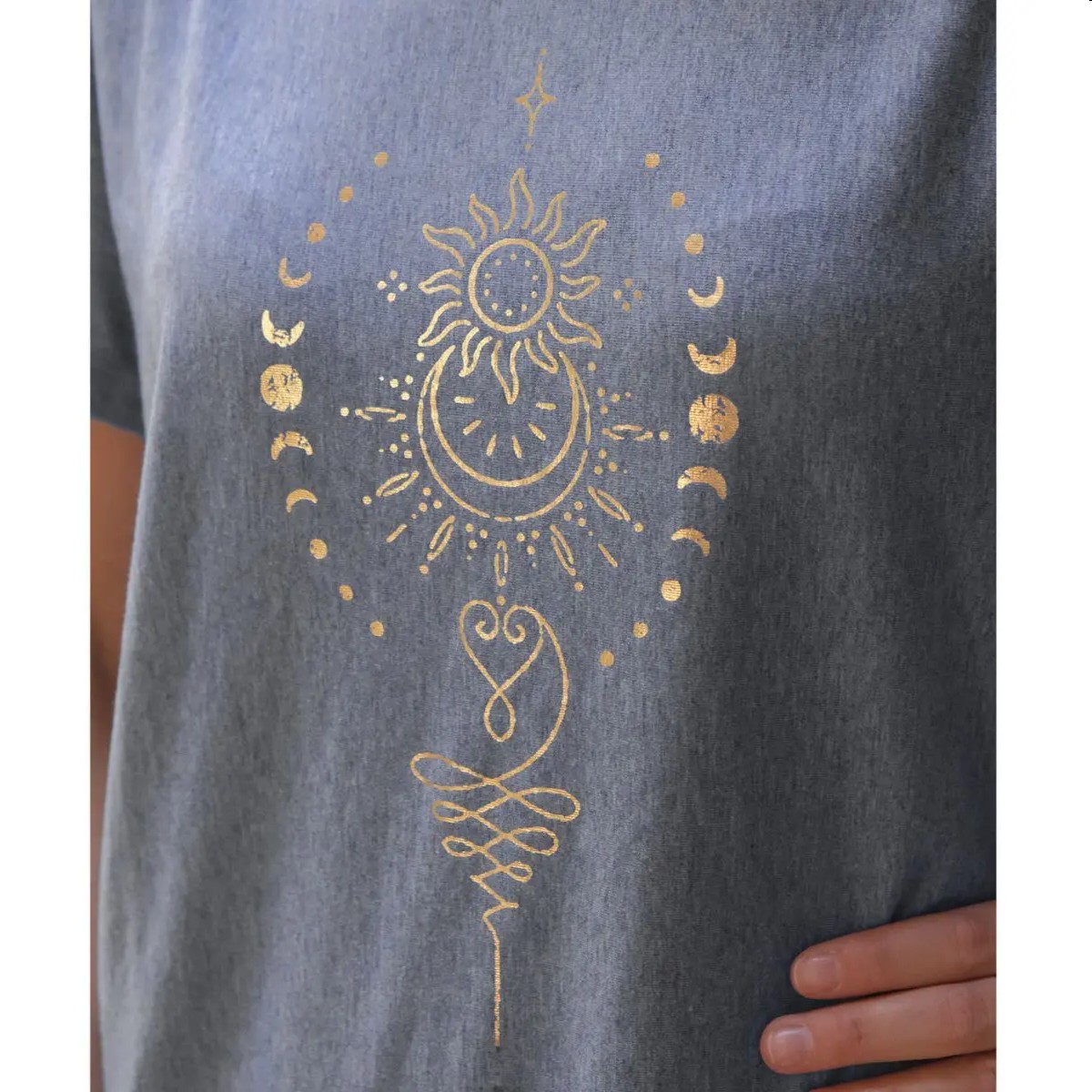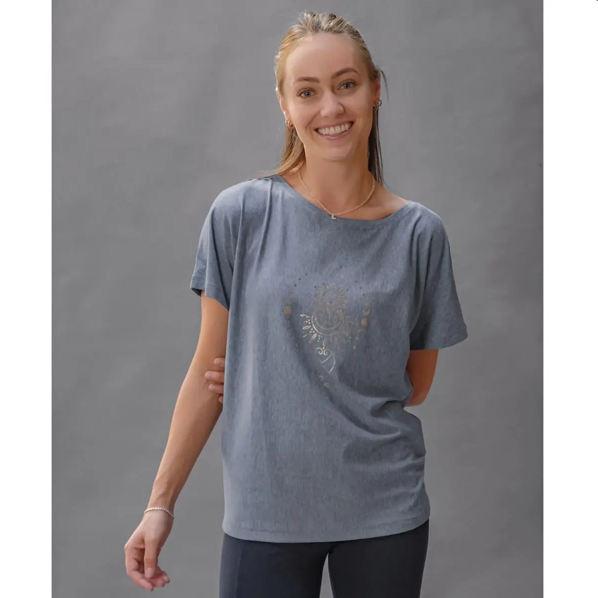 mit Sonne & Mond Druck, aus Melange-Stoff, im Innendruck die Affirmation: I am grateful, i am free, i am complete. 68% Viskose (aus Bambuszellstoff), 28% Baumwolle (kbA), 4% Elasthan, mit microfeinem Turmalin im Stoff, lockere Passform, modisch überschnittene Schultern, Rundhals Ausschnitt, von Spirit of Om