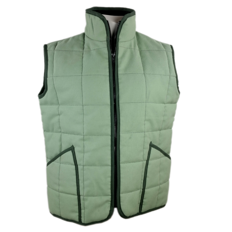 Warme Weste mit Kragen mit 100% Alpakawolle versteppt, Oberseite 100% Baumwolle, fester Panamastoff in grün, Innenseite 100% Baumwolle schwarz, Universalschnitt für Damen und Herren.