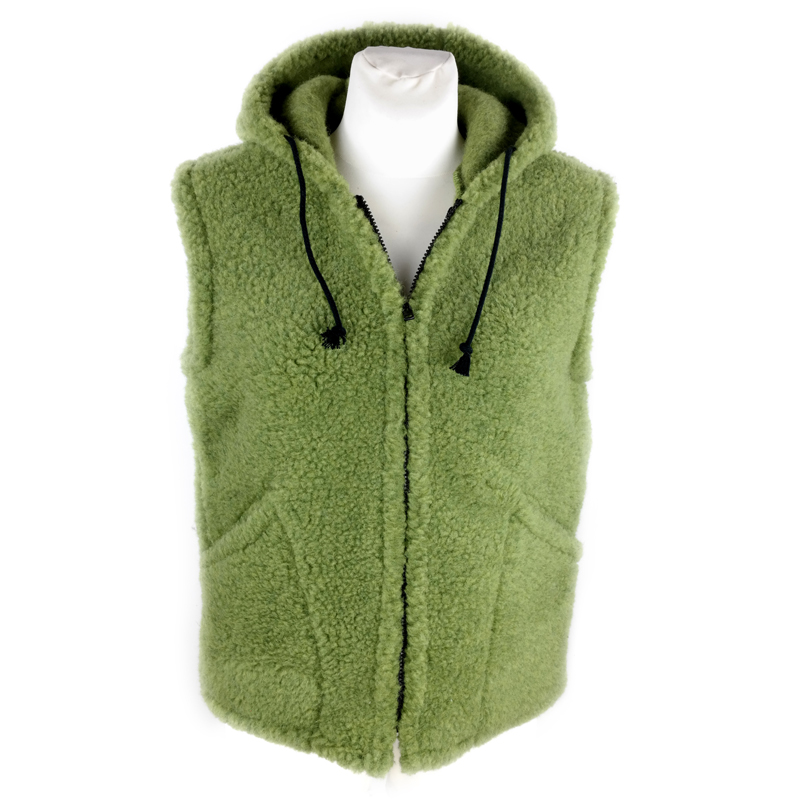 | Die Weste aus grün gefärbtem Wollflor in Schafwolle mit Kapuze ist vor allem für den Außenbereich geeignet. Über einen warmen Pullover gezogen bringt sie diese Weste gut durch Frühjahr und Herbst, ist aber auch ganzjährig ein guter Partner.