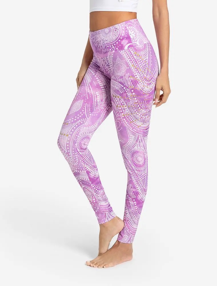 Material: 95% Baumwolle (aus Bio-kbA, kontrolliert biologischer Anbau), 5% Elasthan, mit elastischem breitem Taillenbund, hoher Bund für sicheren Halt, kleine Tasche im Bund, Mandala-Muster, in die Legging wurde mikrofeiner Rosenquarz Edelstein eingearbeitet, langes Bein, körpernahe anliegende Passform mit schmalem Bein, ökologisch digitale Färbung ohne Wasserverbrauch, vegan, von Spirit of Om