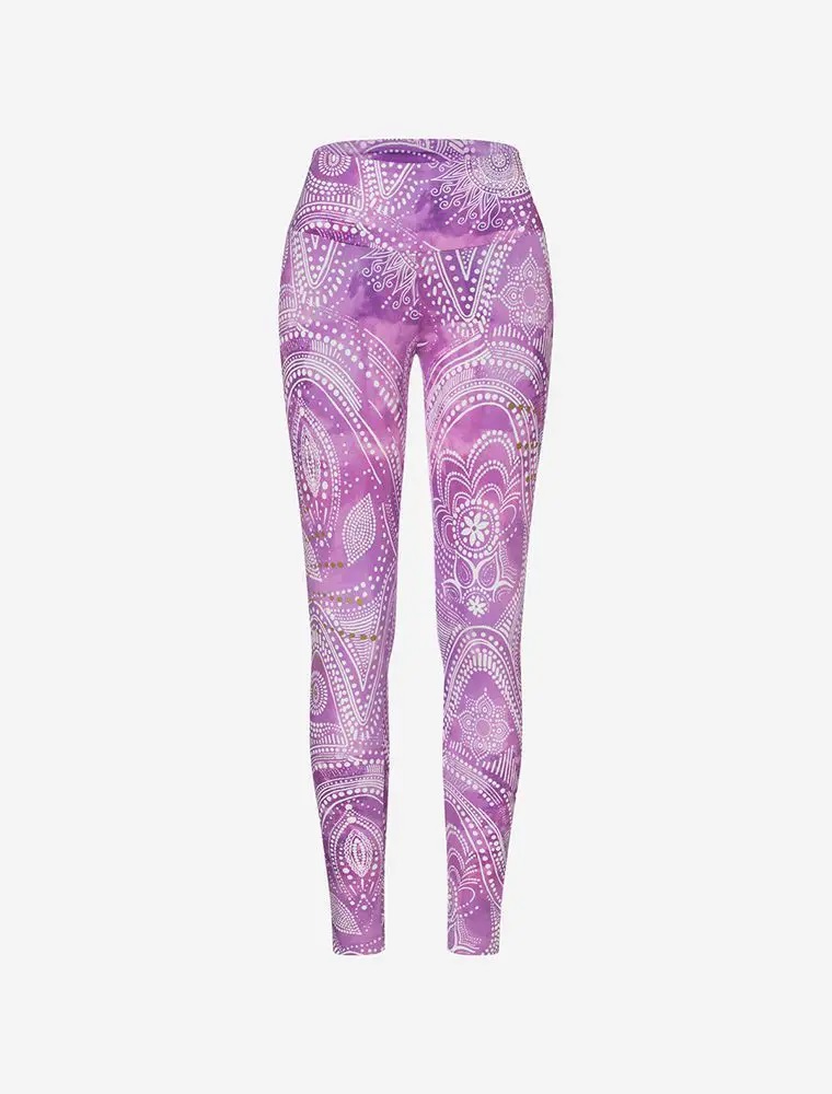Material: 95% Baumwolle (aus Bio-kbA, kontrolliert biologischer Anbau), 5% Elasthan, mit elastischem breitem Taillenbund, hoher Bund für sicheren Halt, kleine Tasche im Bund, Mandala-Muster, in die Legging wurde mikrofeiner Rosenquarz Edelstein eingearbeitet, langes Bein, körpernahe anliegende Passform mit schmalem Bein, ökologisch digitale Färbung ohne Wasserverbrauch, vegan, von Spirit of Om