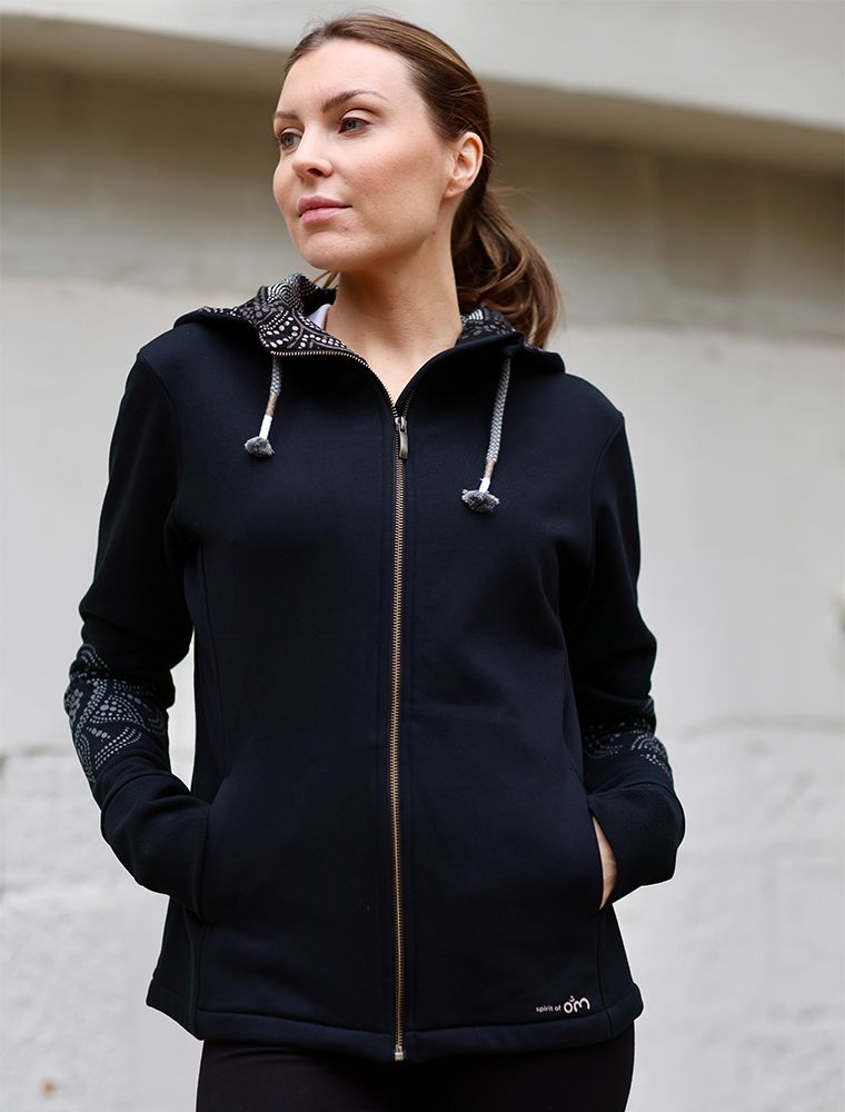 Material: 95% Baumwolle (kbA) GOTS-zertifizierte Bio-Baumwolle, 5 % Elastan, Edelstein : mikrofeiner Turmalin im Stoff, schmale, figurnahe anliegende Passform mit komfortablen Seitenteilen und einer doppellagigen Kapuze, mit einem Allover-Jersey gefüttert, funktionale Daumenschlitze in den Ärmeln, zwei praktische Nahttaschen, beigefarbener Siebdruck auf der Vorderseite, Blumen-Punkte-Mandala auf den Ärmeln, Print mit Blume des Lebens und Affirmation im Maui-Blumenmandala im Inneren der Jacke, fair und nachhaltig in Europa produziert, vegan