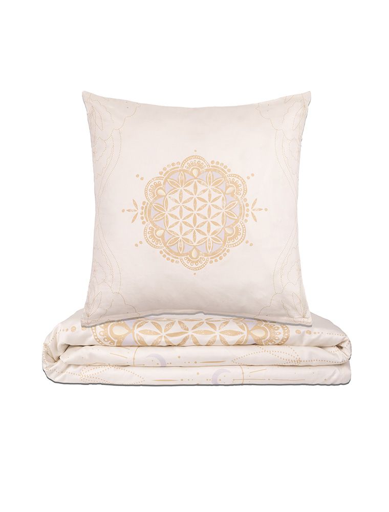 Mit dieser Bio-Bettwäsche bringst du Leichtigkeit und Helligkeit in dein Schlafzimmer. Das zarte Cremeweiß bildet die Grundlage für edle, goldfarbene Ornamente, die von der Blume des Lebens inspiriert sind. Feinste Linien und filigrane Muster verleihen eine elegante Ausstrahlung und schaffen ein Gefühl von Klarheit und Ruhe. Light Dream vereint sanfte Farben mit harmonischen Symbolen und schenkt dir ein Schlafgefühl voller Geborgenheit, Reinheit und Leichtigkeit. Die Vorder- und Rückseiten von Kissen und Decken haben unterschiedliche, wunderschöne Muster. Die Rückseite hat jeweils eine herrlich wärmende Biberqualität. Unsere Bettwäsche wird aus hochwertiger Bio-Baumwolle hergestellt. Sie sind gut für deine Haut und die Umwelt. Die GOTS Zertifizierung gewährleistet, dass keine schädlichen Chemikalien oder Pestizide in der Produktion verwendet werden und während der kompletten Produktionskette nachhaltige und faire Arbeitsbedingungen eingehalten wurden. Diese Bettwäsche besticht durch den eingearbeiteten Rosenquarz Edelstein im Stoff. Rosenquarz ist bekannt für seine herzöffnenden Eigenschaften und seine Fähigkeit, Liebe, Selbstakzeptanz und emotionales Gleichgewicht zu fördern. Mache deinen Schlafraum zu einer natürlichen und gesunden Oase, in der du durch den Rosenquarz eine tiefere Verbindung zu dir selbst aufbauen und erleben kannst. |