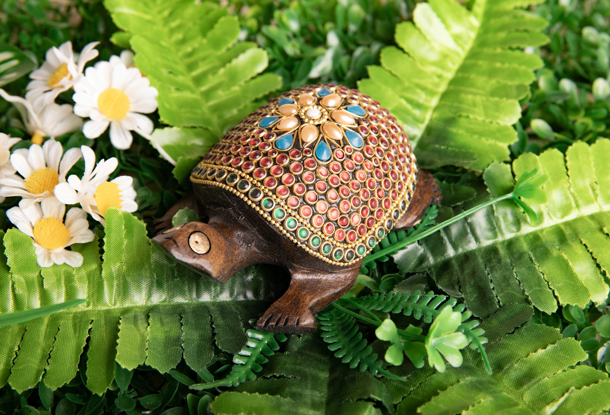 Wie aus einer anderen Welt funkelt sie mit unzähligen, facettierten Glassteinchen in unser Dasein. Die Schildkröte zeigt uns ein Fortkommen mit Ruhe und Beständigkeit. Nicht hektische Betriebsamkeit führt zum Ziel, sondern wohlüberlegte Gelassenheit. Sie entführt uns in eine Welt des Zaubers und der Magie und lehrt uns die Wahrheit über Zeit. |
