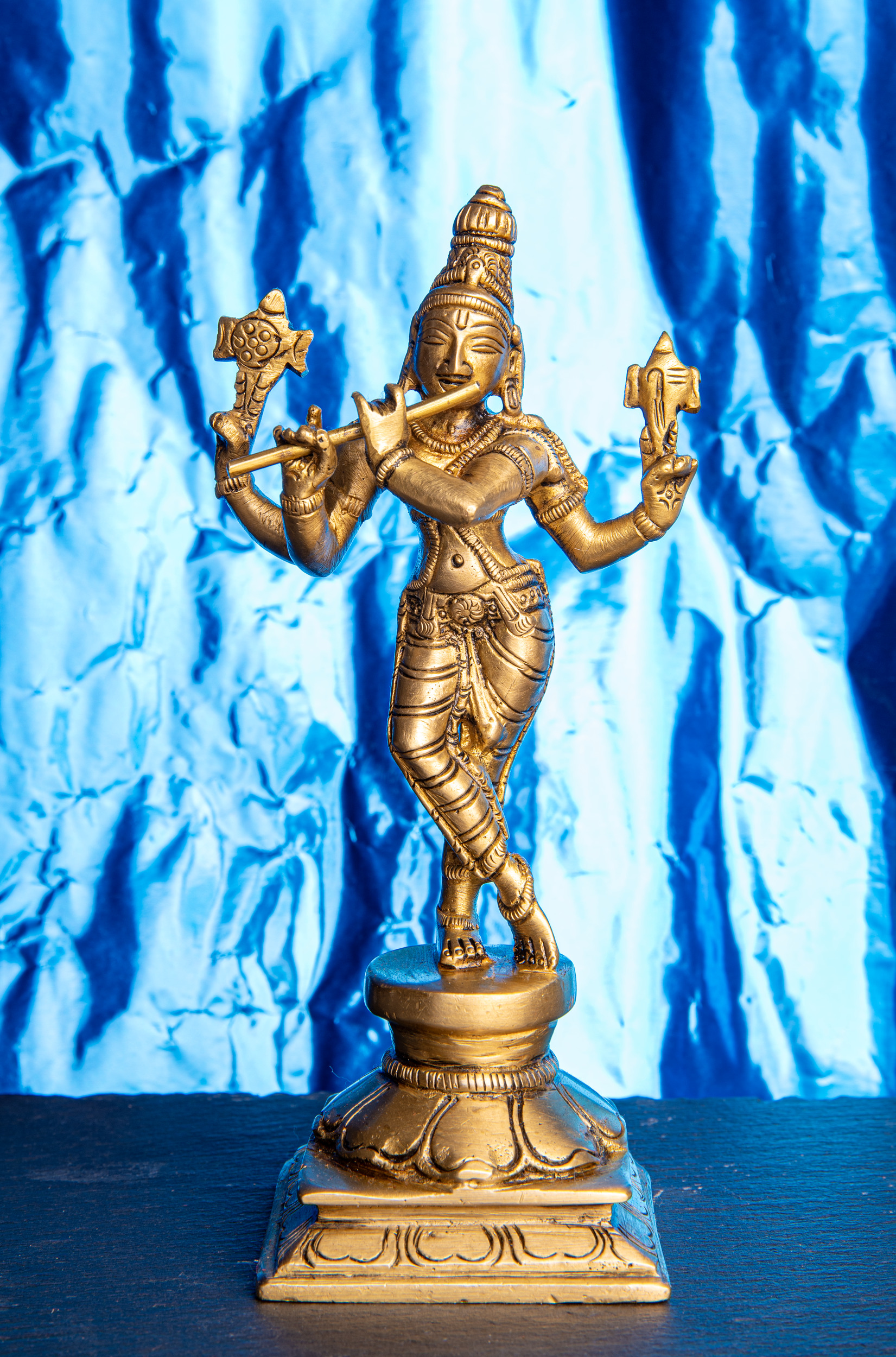 Krishna ist die achte Erscheinungsform (Avatar) Vishnus. Er ist Wagenlenker des Prinzen Arjuna und verkündet die Bhagavadgita, in der er sich selbst als höchsten Gott bezeichnet. Die Flöte ist ein Symbol für den Menschen, der durch den Hauch des Schöpfers belebt wird und in Harmonie mit ihm erklingt.  |