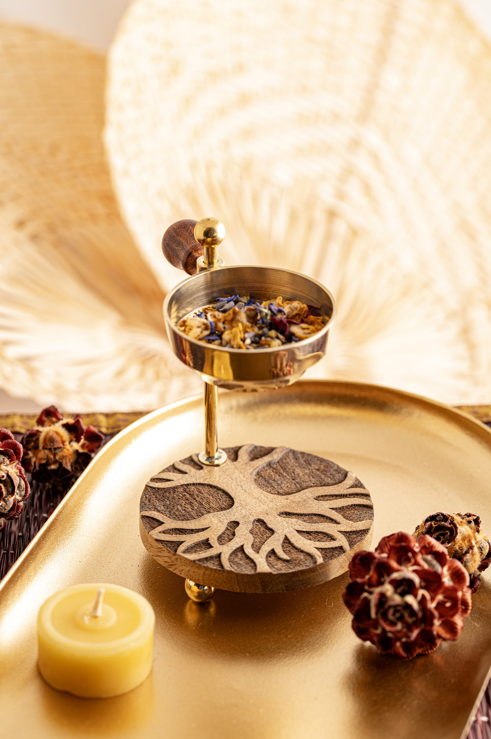 aus Messing und Sockel aus robustem Mangoholz, mit gelochtem Sieb Einsatz