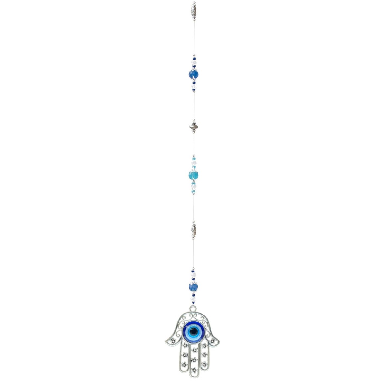 | Schützender Glanz - Dieser Suncatcher zeigt die traditionsreiche Hand der Fatima, ein Schutzsymbol gegen negative Einflüsse, ergänzt durch drei Glasornamente in zarten Blautönen. Die Hamsa vermittelt Sicherheit, Frieden und positive Energie. Mit seinen Maßen von 5 x 50 cm ist er eine elegante Ergänzung für Fenster, Balkontüren oder helle Flure. Ein dekorativer Schutzbringer, der Symbolkraft und dezentes Lichtspiel vereint. |