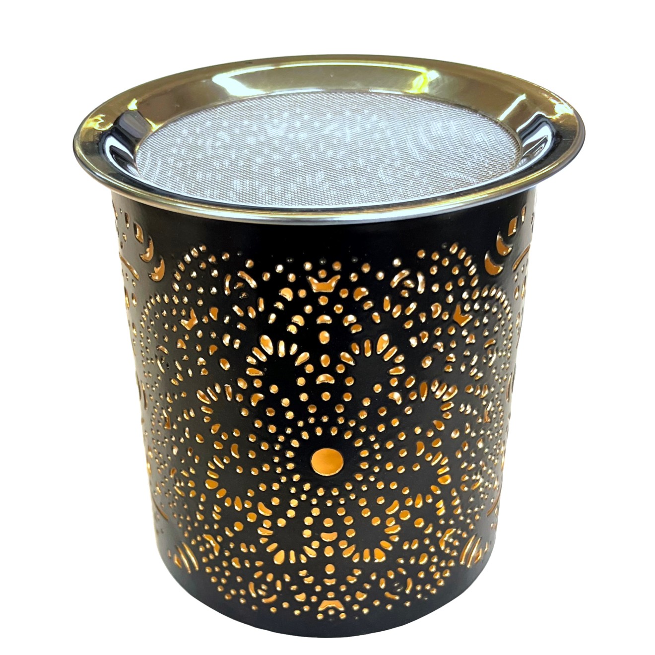 aus Stahl mit ausgelasertem Muster, aussen schwarz, innen goldfarben, mit Räucher-Sieb D 10cm
