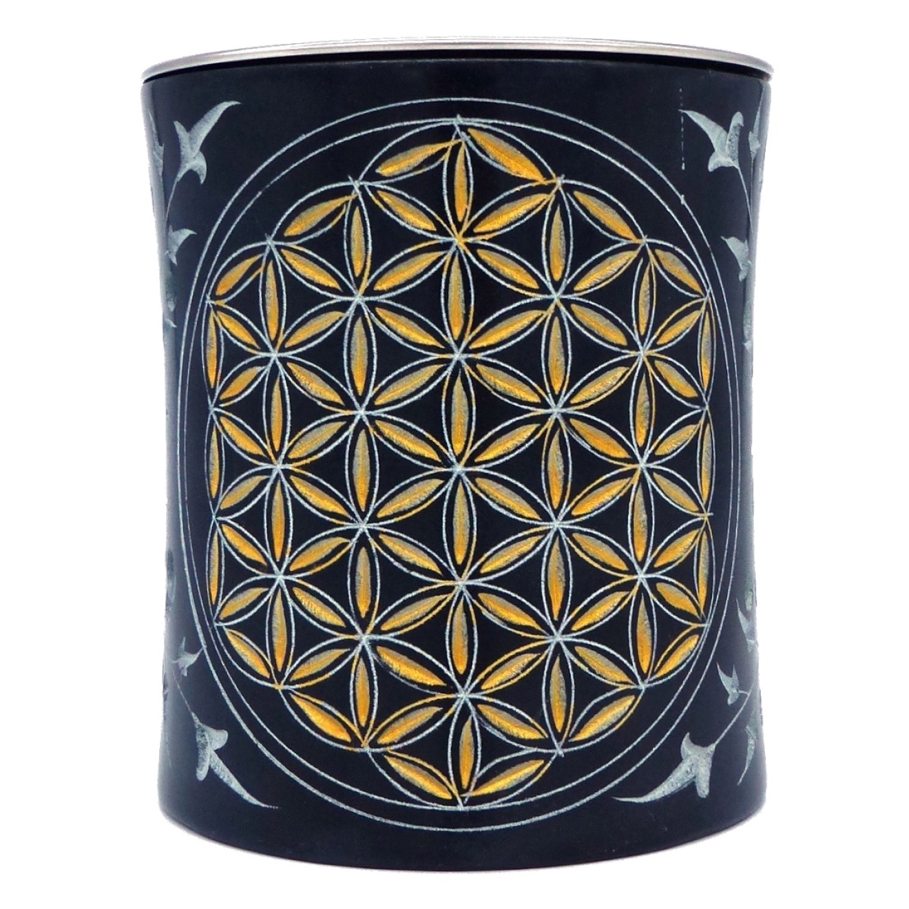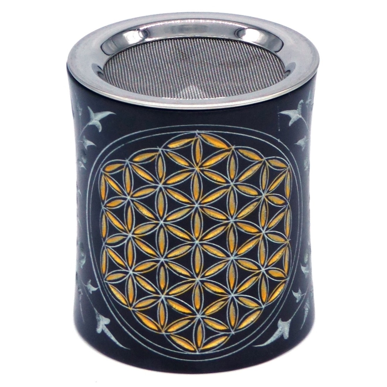 Räuchergefäß Säule aus Black Stone schwarz mit Blume des Lebens gold, mit Räucher-Sieb