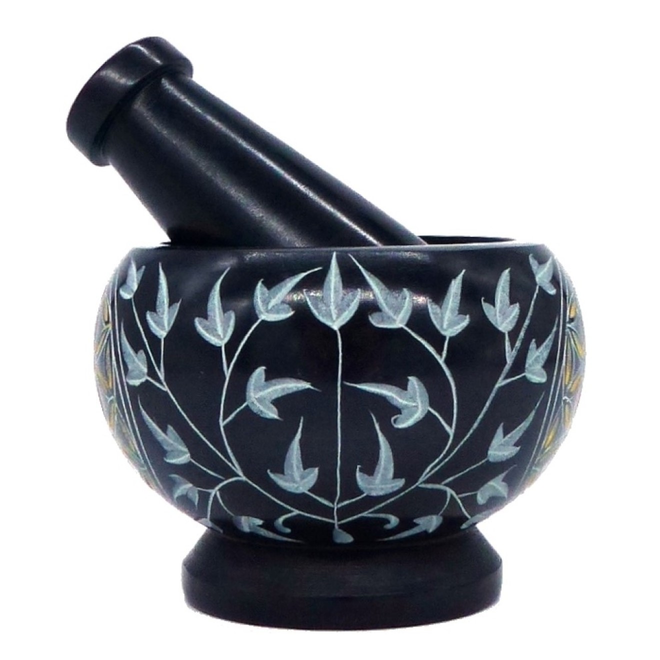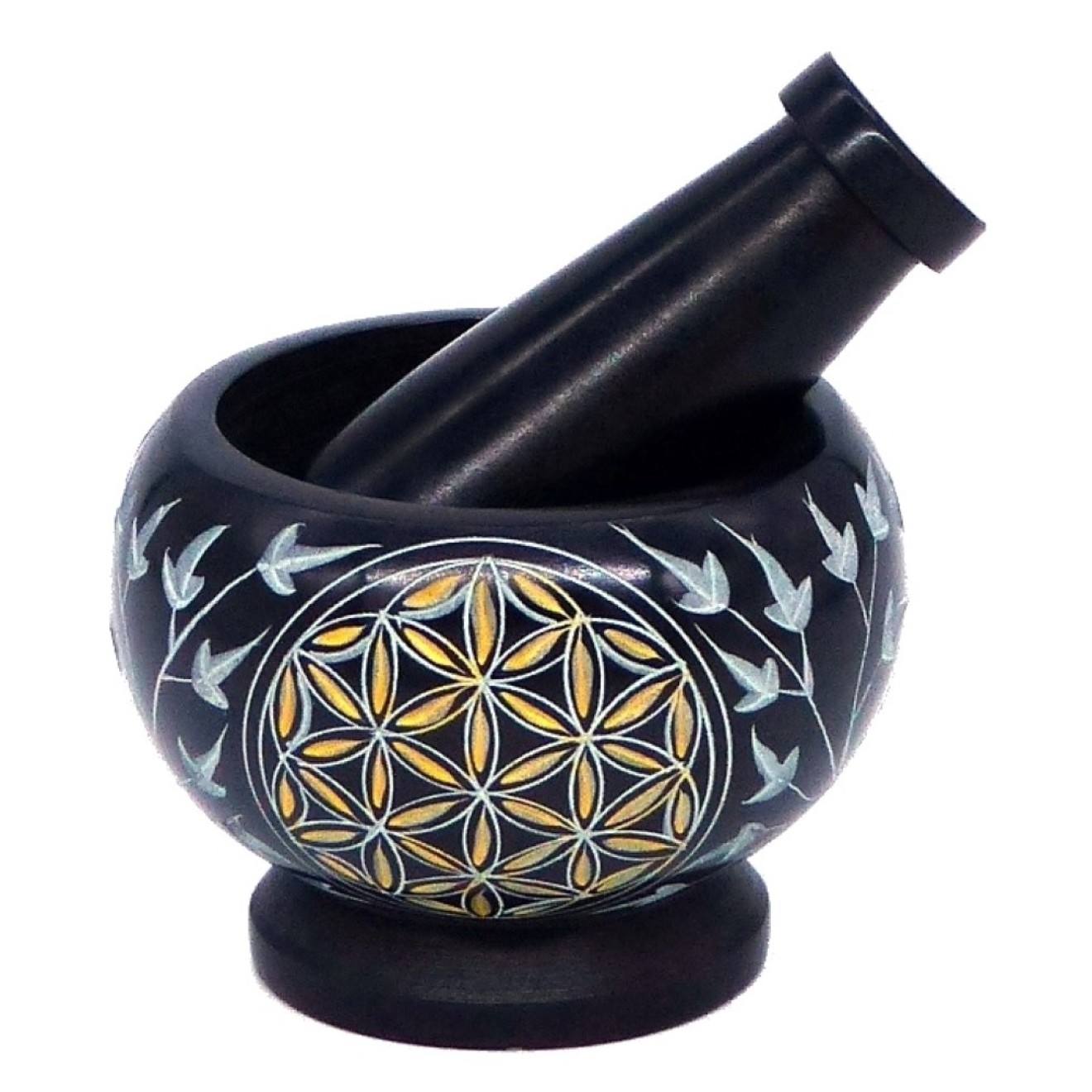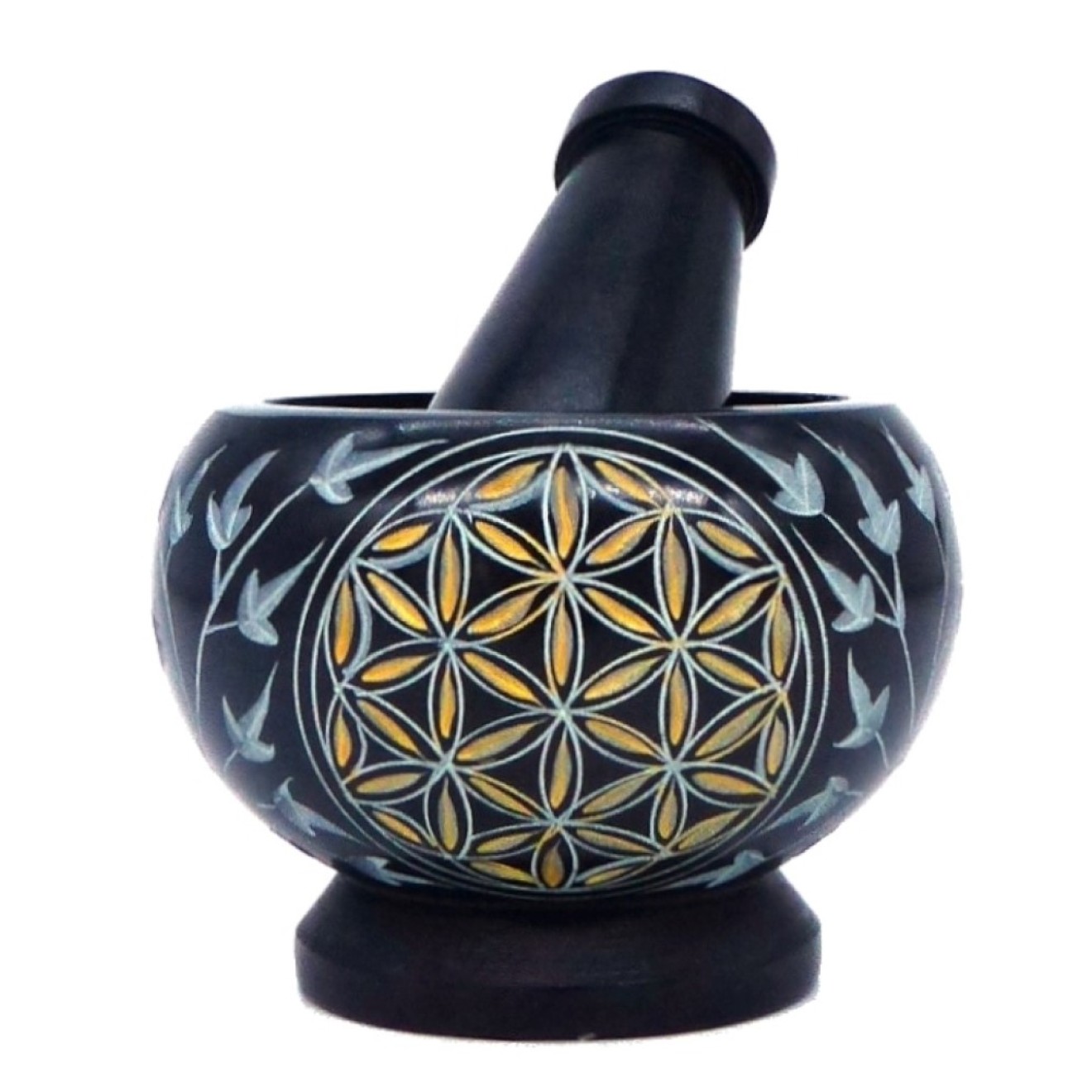 Mörser schwarz mit Blume des Lebens in gold, mit Stößel, aus Black Stone