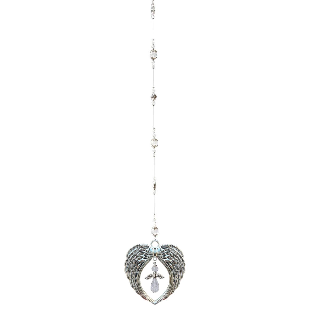 | immlische Klarheit Der Suncatcher Wings of Light vereint zarte Eleganz mit spiritueller Symbolik. Transparente Glaskugeln fangen das Licht ein und führen den Blick zu filigranen Engelsflügeln, in deren Mitte ein klarer Glasengel schwebt. Die Kombination steht für Reinheit, Schutz und himmlische Führung – ein Symbol des Lichts, das Ruhe und Harmonie in jeden Raum bringt. Mit einer Länge von 65 cm ist er ideal für Fenster oder helle Wohnbereiche. Ein bezauberndes Dekorationselement, das Licht und Frieden in dein Zuhause trägt. |