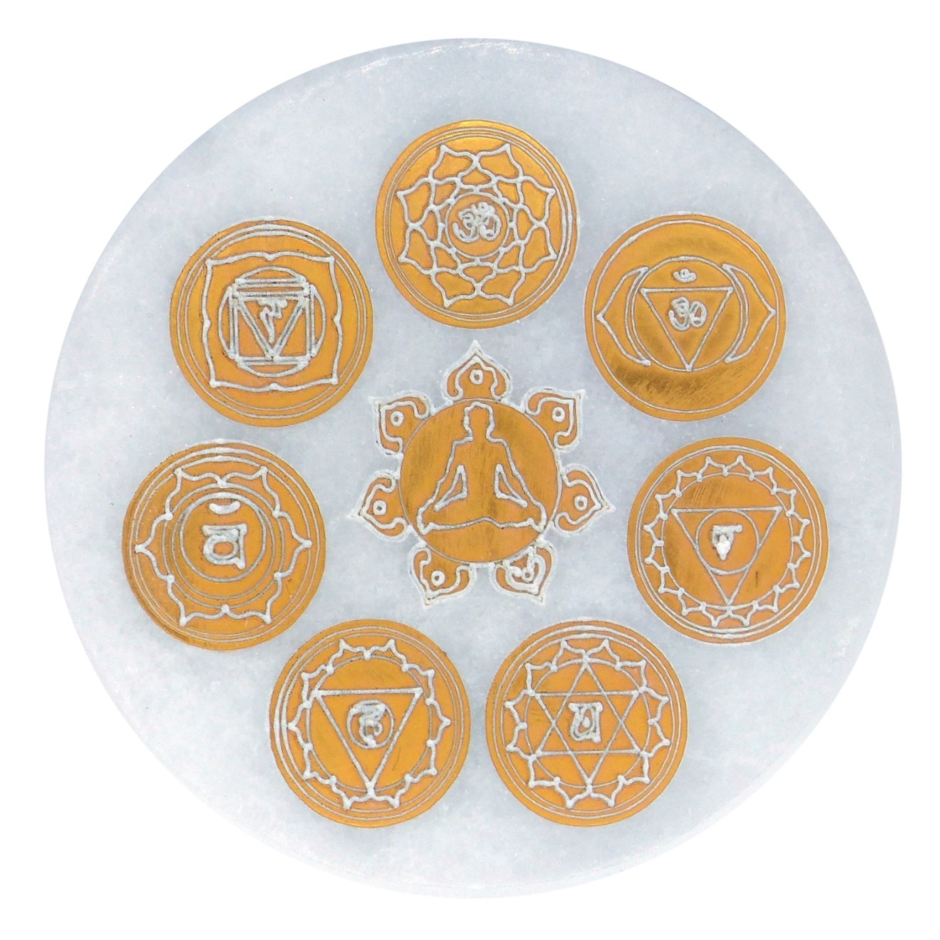 Selenit-Energiescheibe mit Chakrasymbolen in gold und Buddha, 10cm