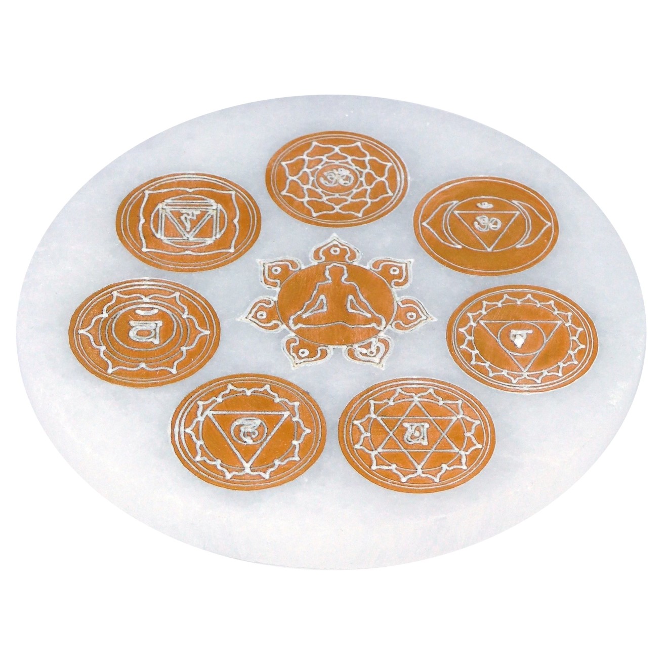 Selenit-Energiescheibe mit Chakrasymbolen in gold und Buddha, 14cm