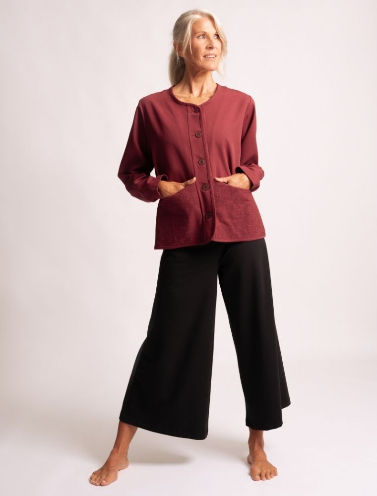 | Freude, die wärmt, Die Jacke Navun (Sanskrit: नवून) trägt ihren Namen mit Leichtigkeit. Navun steht sinnbildlich für Lachen, für Offenheit und für die Wärme, die entsteht, wenn Kleidung Geborgenheit schenkt. Dieses Modell vereint feine Handarbeit, natürliche Materialien und liebevolle Details zu einem Stück, das Freude spürbar macht. Das Material aus hochwertiger Bio-Baumwolle liegt weich auf der Haut und ist angenehm atmungsaktiv. Ein besonderes Detail sind die Knöpfe aus reiner Baumwolle. Sie unterstreichen den natürlichen Charakter der Jacke – ein kleiner, aber bedeutender Unterschied, der Qualität und Nachhaltigkeit sichtbar macht. Die Taschen zeigen eine tonige Mustersteppung, die dem Design Hochwertigkeit und eine besondere Tiefe verleiht. Im Inneren findet sich auf dem Rückteilbeleg ein Goldfolienprint – ein liebevolles Element, das an Freude und Leichtigkeit erinnert. Der Innenbeleg in sanftem Perlrosa bildet einen zarten Kontrast zum tiefroten Oberstoff. Fein eingearbeiteter Rosenquarz, dem eine herzöffnende und harmonisierende Wirkung zugeschrieben wird, kann der Trägerin ein Gefühl von Ruhe und Geborgenheit schenken. |