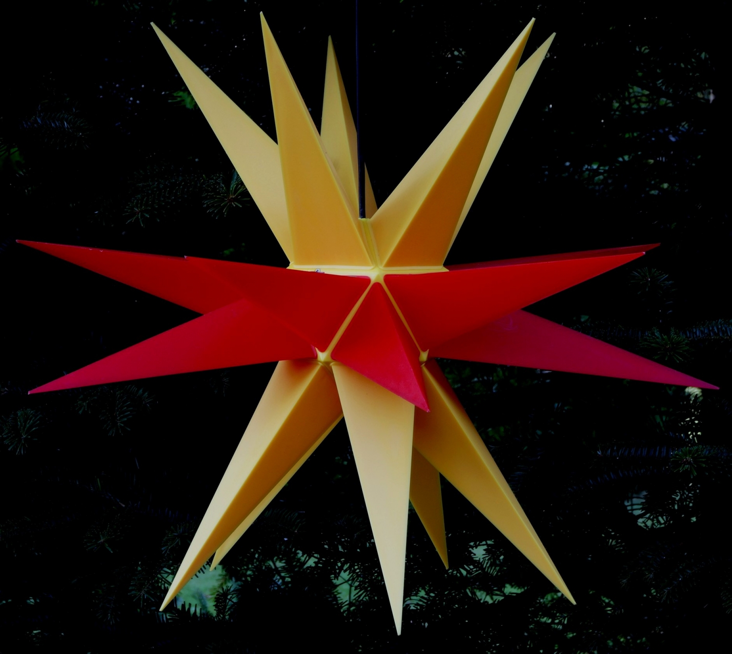 langlebiger wetterfester Außenstern Ø 60 cm aus stabiler Hartplastik mit 20 festen Spitzen in dreieckiger Grundform. inkl. passendes 4m langes Outdoorkabel. Das Leuchtmittel ist nicht enthalten. Die Spitzen werden mit wenigen Handgriffen in einen festen Grundkörper eingeklickt. Die Montagezeit beträgt ca. 5-10 Minuten. Stromstecker Type C - 2 pin (Europlug)