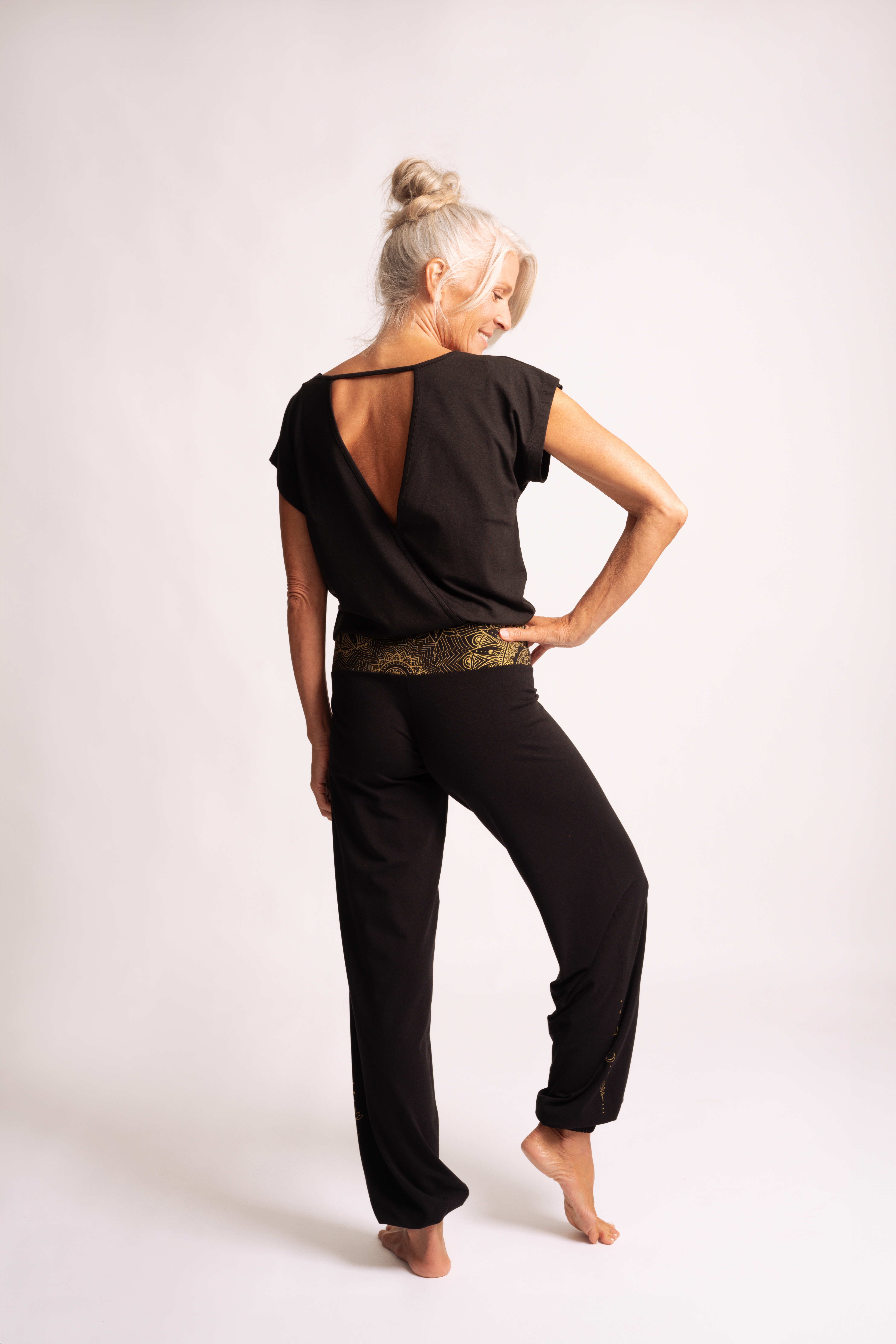 Material: 68% Viskose (aus Bambus-Zellstoff), 28% Baumwolle, 4% Elastan, V-Neck im Rückenteil, feiner Golddruck mit OM-Symbol im Herz auf der Hüfte, weicher, fließender Stoff aus Bambus-Viskose, lockerer comfort fit Schnitt für optimale Bewegungsfreiheit, vegan und fair produziert Hersteller Spirit of OM
