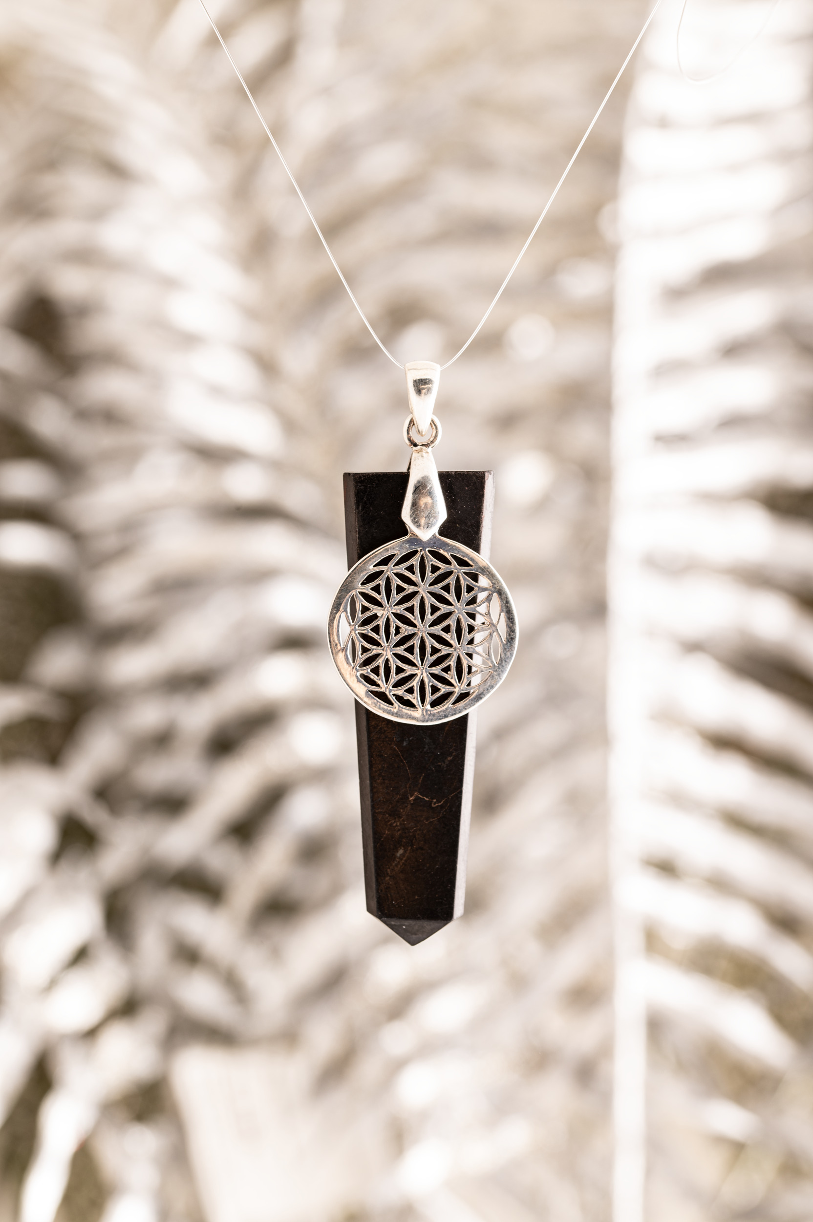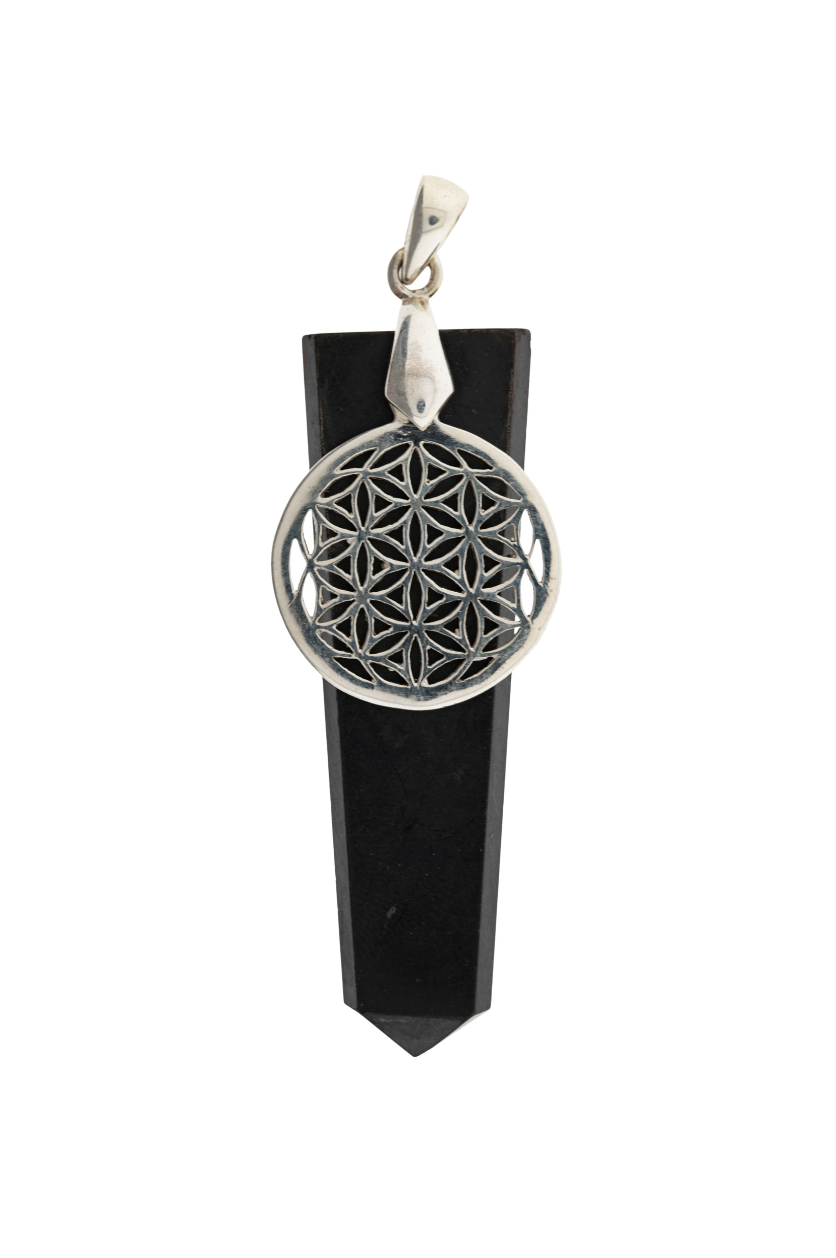 Tiefschwarzer Schungit mit Charm Blume des Lebens Yggdrasil aus aus 925er Silber