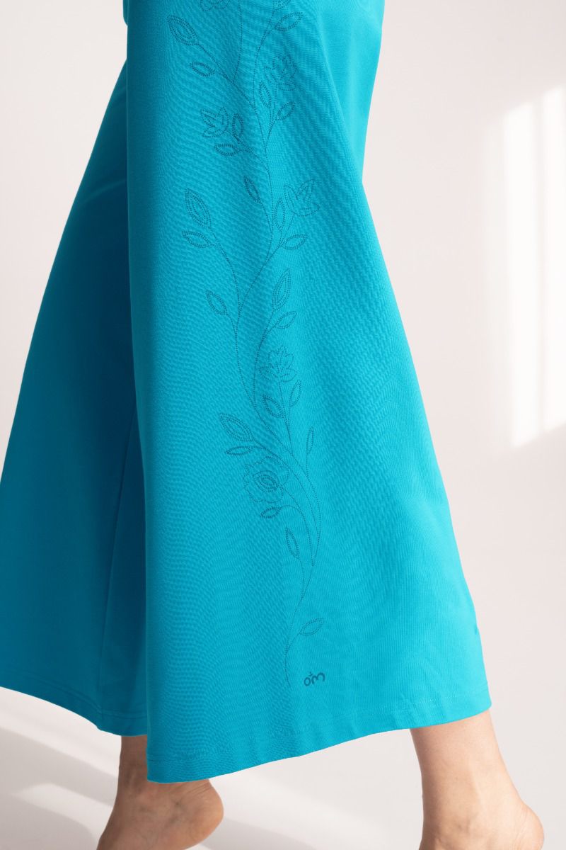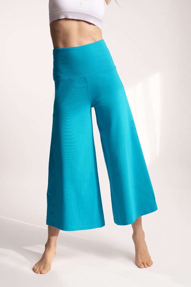 | Devi Nava ist fließend, modern und mit liebevollen Details. Devi bedeutet im Sanskrit Göttin und steht für Würde, feminine Kraft und innere Ruhe. Die Culotte sitzt im Flow Fit locker am Bein, mit breitem Bund und einer fließenden Silhouette. Das Bein ist weit geschnitten und leicht ausgestellt, wodurch beim Gehen und Bewegen ein schöner, weiter Fall entsteht – luftig, feminin und sehr angenehm zu tragen. In der Farbe Alatsee bringt die Hose Frische in deinen Look. Entlang der Beine verlaufen florale Siebdrucke rechts und links nach oben, dezent eingearbeitet und stilvoll platziert. Hinten auf dem Bund sitzt ein Chakra-Symbol als Goldprint (Svadhisthana) – ein stimmiges Detail, das für Lebensfluss und kreative Energie steht. Im Stoff ist mikrofeiner Turmalin verarbeitet, waschfest im Gewebe integriert. Turmalin wird traditionell mit Schutz und innerer Balance in Verbindung gebracht und begleitet dich so ganz unkompliziert im Alltag und in deiner Freizeit. |