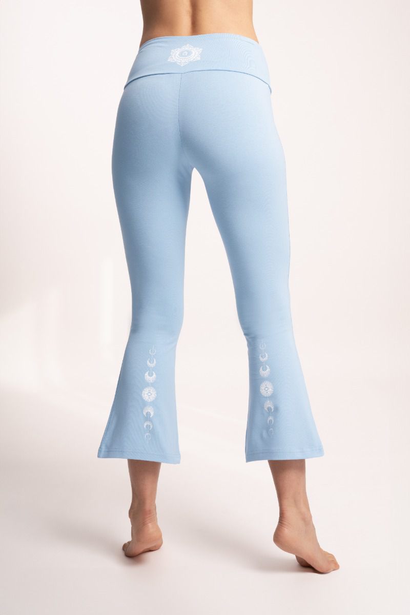 Material: 95% kbA Baumwolle (kontrollierten biologischen Anbau), 5% Elastan (Ökotex Standard 100), als 7/8-lange Flared-Leg-Hose geschnitten: Ab dem Knie fällt das Bein weit und fließend und endet etwas kürzer, hoher, bequemer Bund, mikrofeiner Turmalin im Stoff, Goldprint mit stilisierten Mondzyklen hinten unten auf den Waden rechts/links, Svadhisthana-Chakra-Symbol als Goldprint hinten auf dem Bund, vegan.