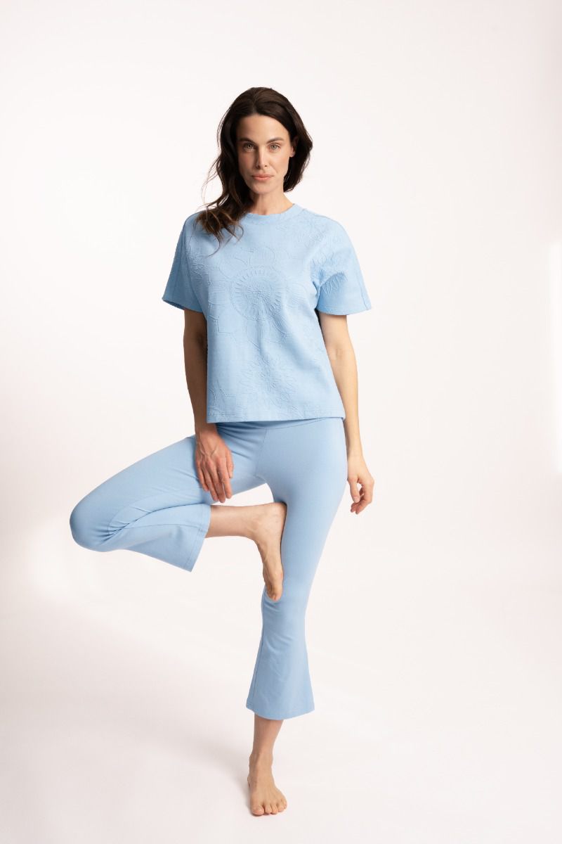 | Vipra steht für einen Weisen, einen Inspirierten, einen innerlich Bewegten – einen Menschen mit spiritueller Erkenntnis und Sensibilität. Genau diese Bedeutung passt zu einer Yoga Hose, die dich an das erinnert, was dir gut tut: Bewegung, Klarheit und dein eigenes Tempo. Die Yoga Hose Vipra ist als 7/8-lange Flared-Leg-Hose geschnitten: Ab dem Knie fällt das Bein weit und fließend, endet dabei etwas kürzer und wirkt dadurch besonders leicht und modern. Die Länge bringt eine frische Silhouette, lässt den Look offener wirken und passt perfekt zu barfuß getragenen Momenten genauso wie zu Sneakern im Alltag. Der hohe Bund sitzt stabil, formt eine schöne Linie und bleibt auch in Bewegung angenehm an Ort und Stelle. In der Farbe Eisblau bekommt Vipra eine ganz eigene Ausstrahlung: klar, ruhig und gleichzeitig lebendig. Der Farbton wirkt leicht, klar und harmonisch – wie ein ruhiger Moment nur für dich. Besonders edel sind die goldenen Prints: Hinten unten auf den Waden zeigen stilisierte Mondzyklen rechts und links einen feinen Akzent. Der Mond steht in vielen Yoga- und Ayurveda-Traditionen für Rhythmus, Wechsel und Intuition – passend zu Tagen, an denen du dich kraftvoll fühlst, genauso wie zu Momenten, in denen du es ruhiger angehst. Auf dem Bund ergänzt das Chakra-Symbol Svadhisthana als Goldprint das Design. Svadhisthana wird traditionell dem Bereich zwischen Becken und Bauchnabel zugeordnet – genau dort, wo der Bund sitzt. Es steht sinnbildlich für Lebensfluss, Kreativität und das gute Gefühl, im eigenen Körper zuhause zu sein. Damit passt dieses Symbol nicht nur optisch, sondern auch inhaltlich perfekt zur Vipra: als feine Erinnerung daran, dich in deiner Bewegung frei zu fühlen, dich selbst ernst zu nehmen und dir Raum zu geben – auf der Matte und im Alltag. So bekommt die Hose ihren charakteristischen Look: feminin, fließend und mit Details, die sich wie kleine Erinnerungen an deine eigene Ausrichtung anfühlen. |