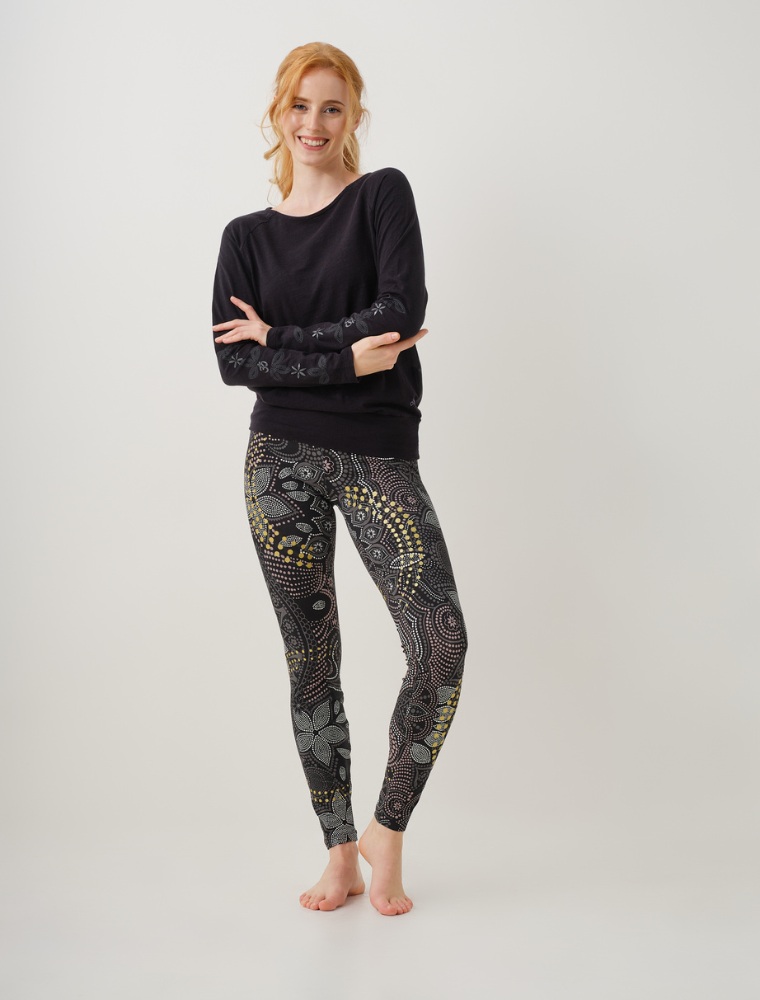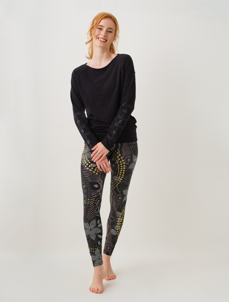 Langarm-Shirt, Material: 100% Baumwolle (kbA), lockerer Schnitt mit Raglanärmeln, Stickerei, Siebdruck und Goldfolienprint an den Ärmeln, Innenprint in Goldfolie, mit mikrofeinem Turmalin im Print, hochwertige Bio-Baumwolle, weich und atmungsaktiv, fair produziert und vegan, Hersteller Spirit of OM