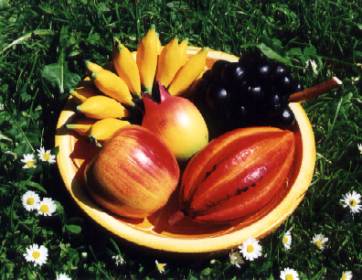 7 naturechte tropische Früchte in grüner Blatt- Schale