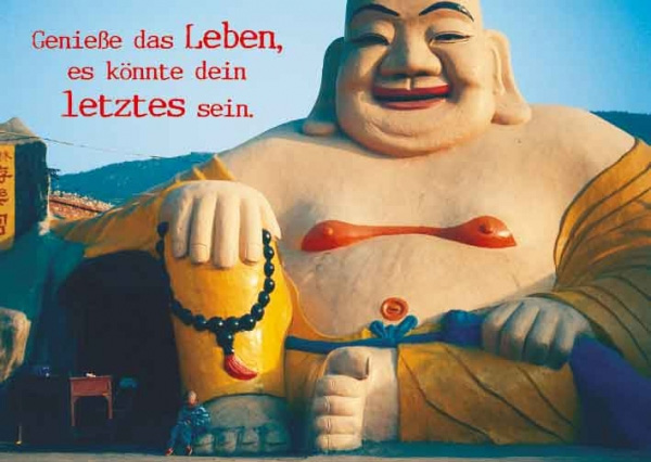 Text-Postkarte Statue Happy Buddha mit darauf sitzendem Menschen