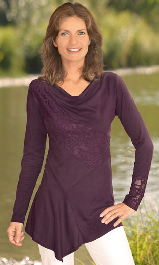 | Die Tunika hat eine schwungvolle Schnittführung mit Blickfang durch zarte Spitzentüll-Applikation. Das weich fallende Bambus/Baumwolle-Material trägt sich herrlich bequem und leicht. |