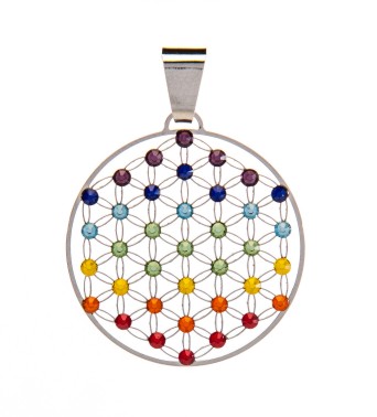 Anhänger Blume des Lebens, Edelstahl, D 2,5 cm, vollbesetzt mit 37 Swarovski Elements in Chakren Farben Energy
