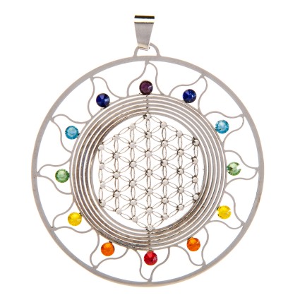 Anhänger Blume des Lebens - Im Licht der Sonne -, aus Edelstahl, D 5 cm, vollbesetzt mit Swarovski Elements in Chakren in den Sonnenstrahlen und Blume des Lebens vollbesetzt mit Swarovski Elements in Crystal Weiss