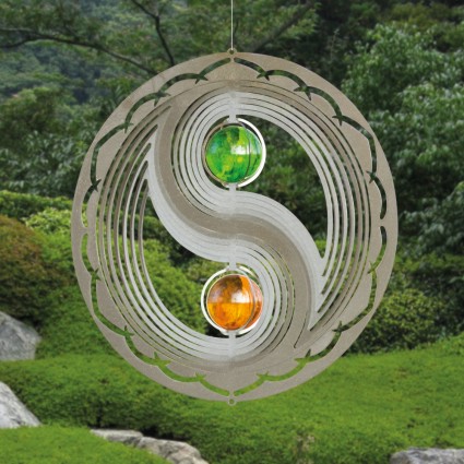 | Die Edelstahlsegmente haben einen dezenten Glitzereffekt. In Kombination mit den Glaskugeln erzeugt dies ein faszinierendes Licht- und Farbspiel. Schon bei einem leichten Windhauch dreht sich das Windspiel und verbreitet mit fließenden Bewegungen eine harmonische Atmosphäre. |