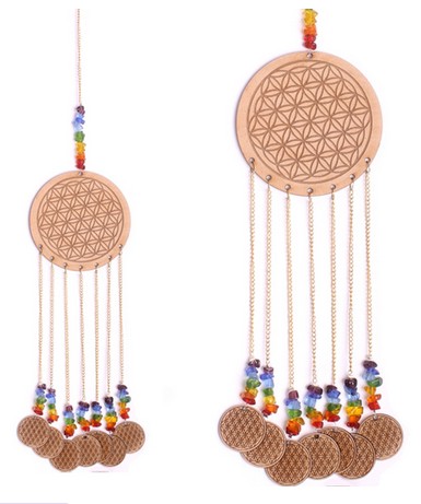 Lebensblumen aus Holz, mit 7 Messingkettchen und Glassteinen in den 7 Chakrafarben, zum Aufhängen