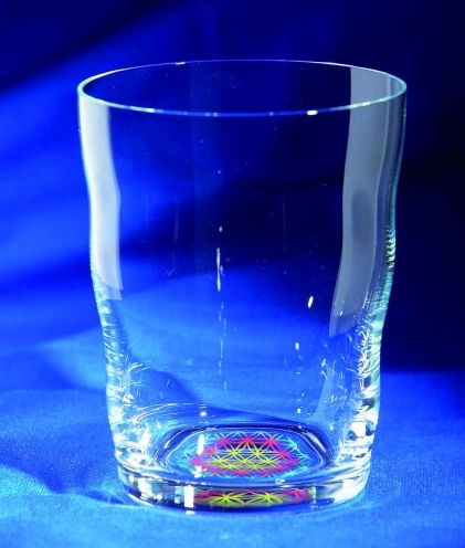 reines mundgeblasenes Kristallglas ohne Schwermetalle, von unten im Boden ist die Blume des Lebens in Regenbogenfarben ins Glas eingebrannt,